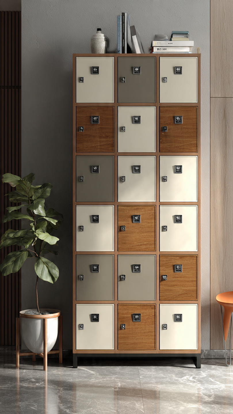 • Tủ locker gỗ công nghiệp: Bề mặt chống trầy xước, chống ẩm, mang tính thẩm mỹ cao, thích hợp cho spa và văn phòng sang trọng.